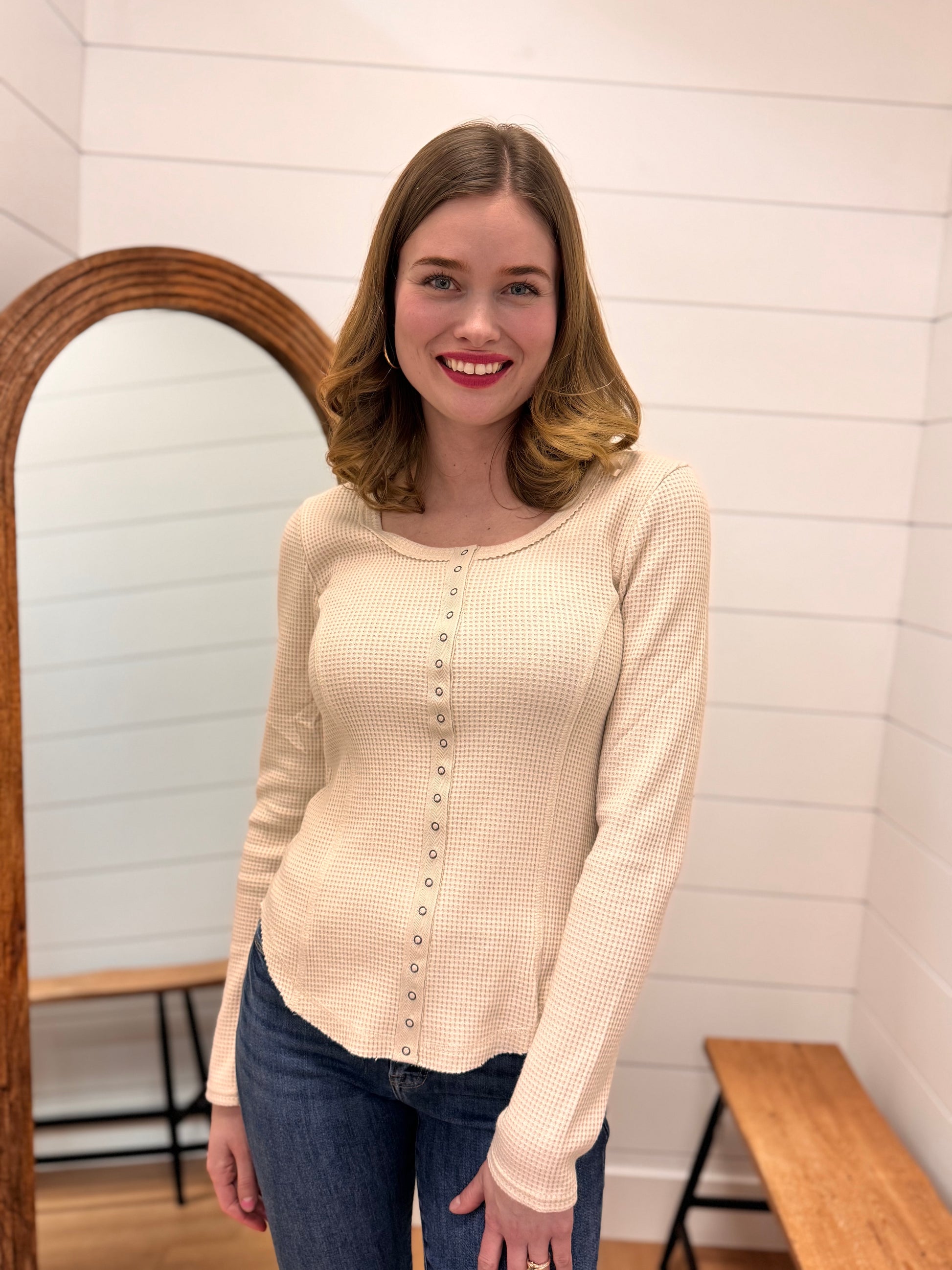 Button Down Fitted Knit Casual Top - Oatmeal