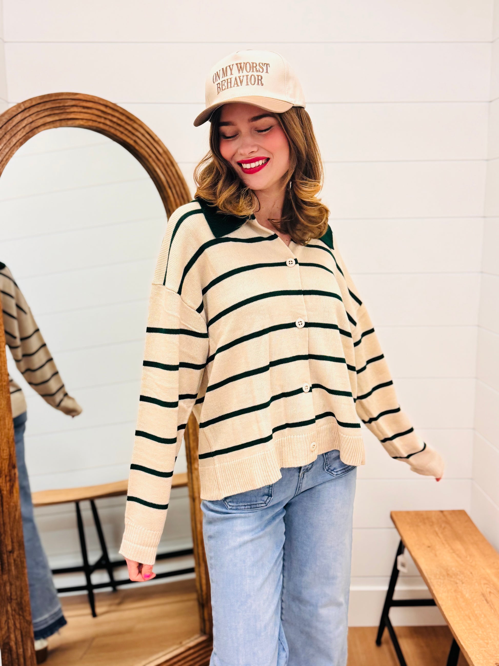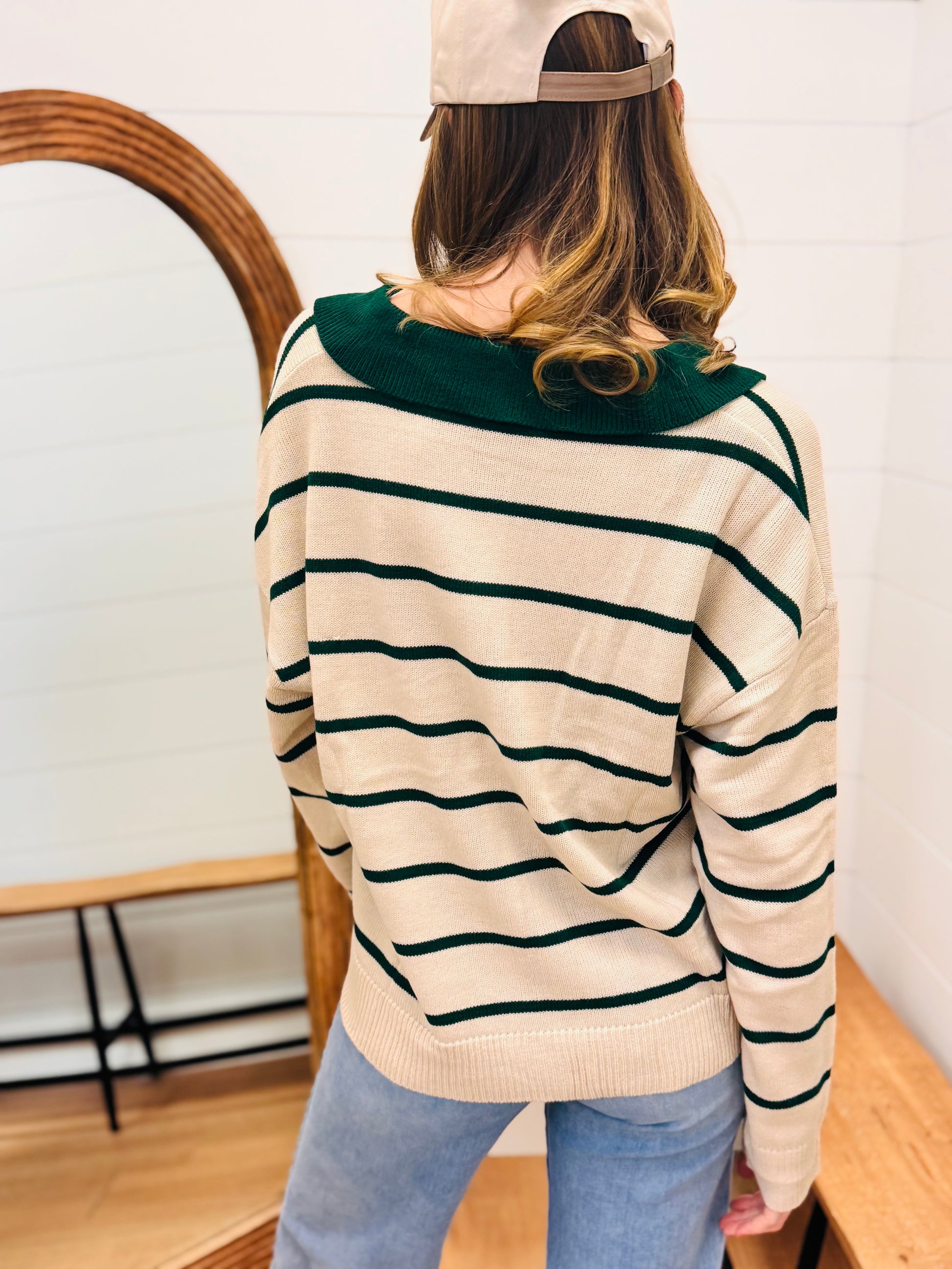 Button Down Sweater with Contrast Stripes and Collar