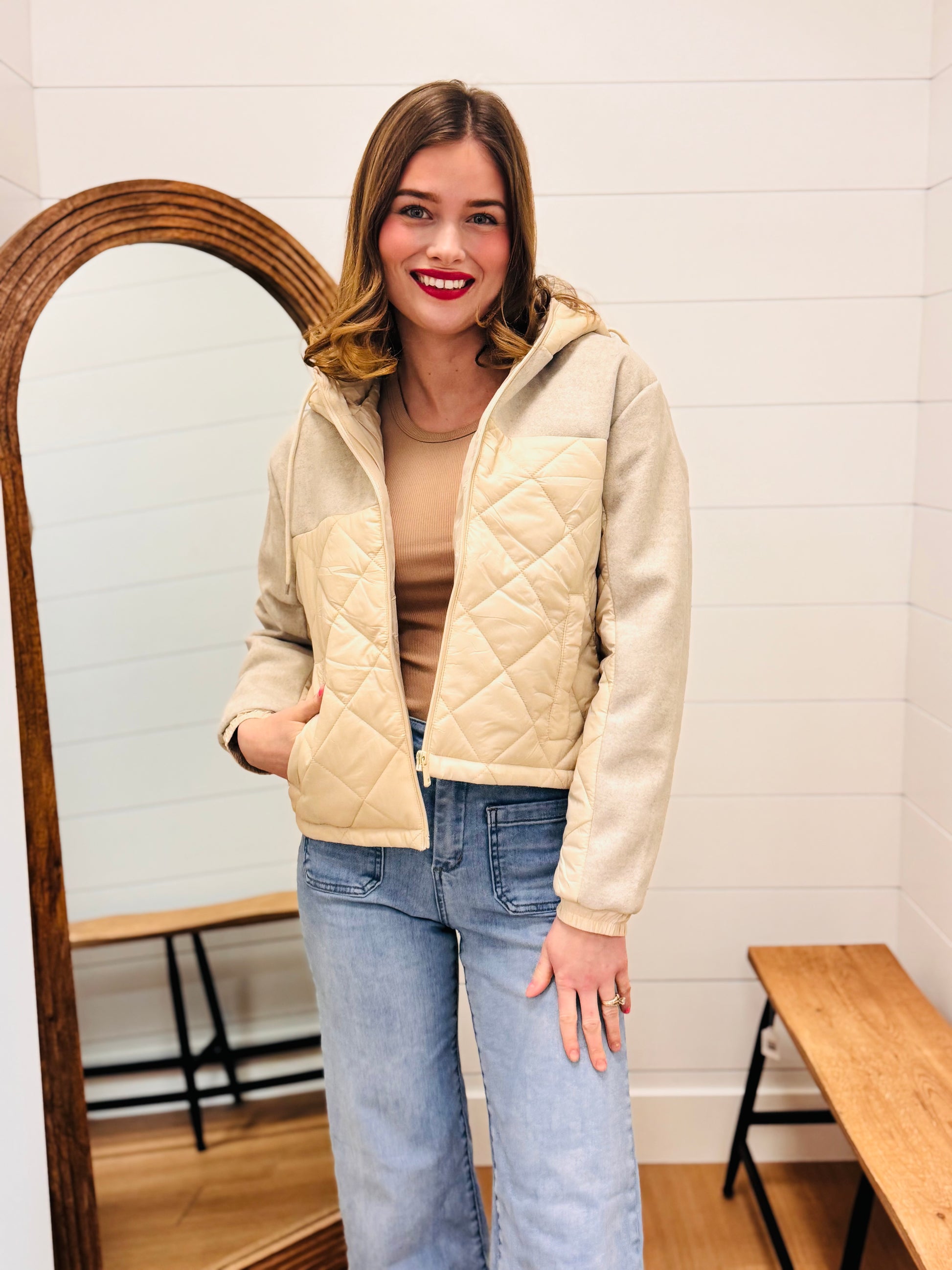 Contrasting Quilted And Soft Hoodie Jacket