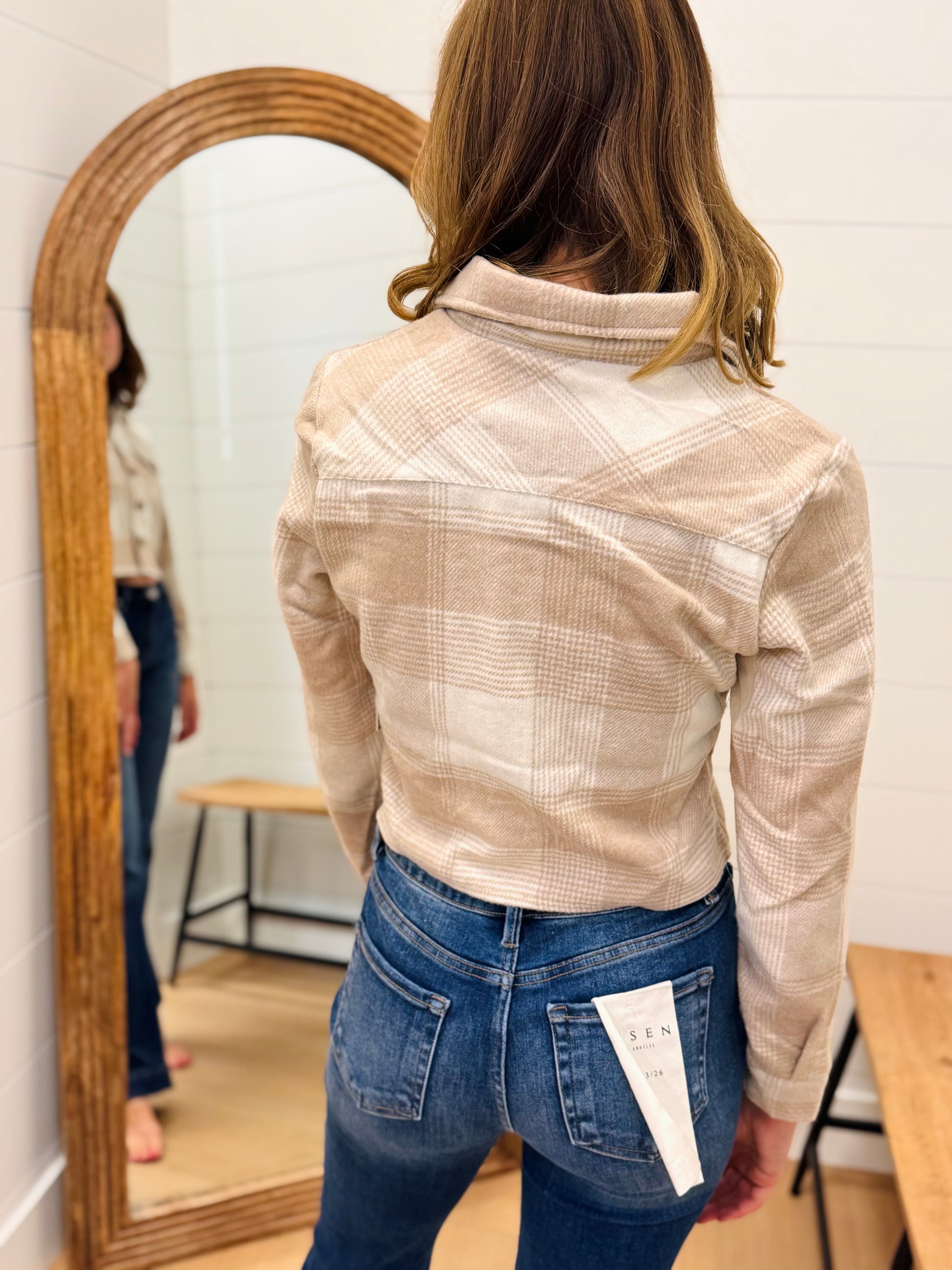 Cropped Casual Plaid flannel Jacket - Cream + Taupe