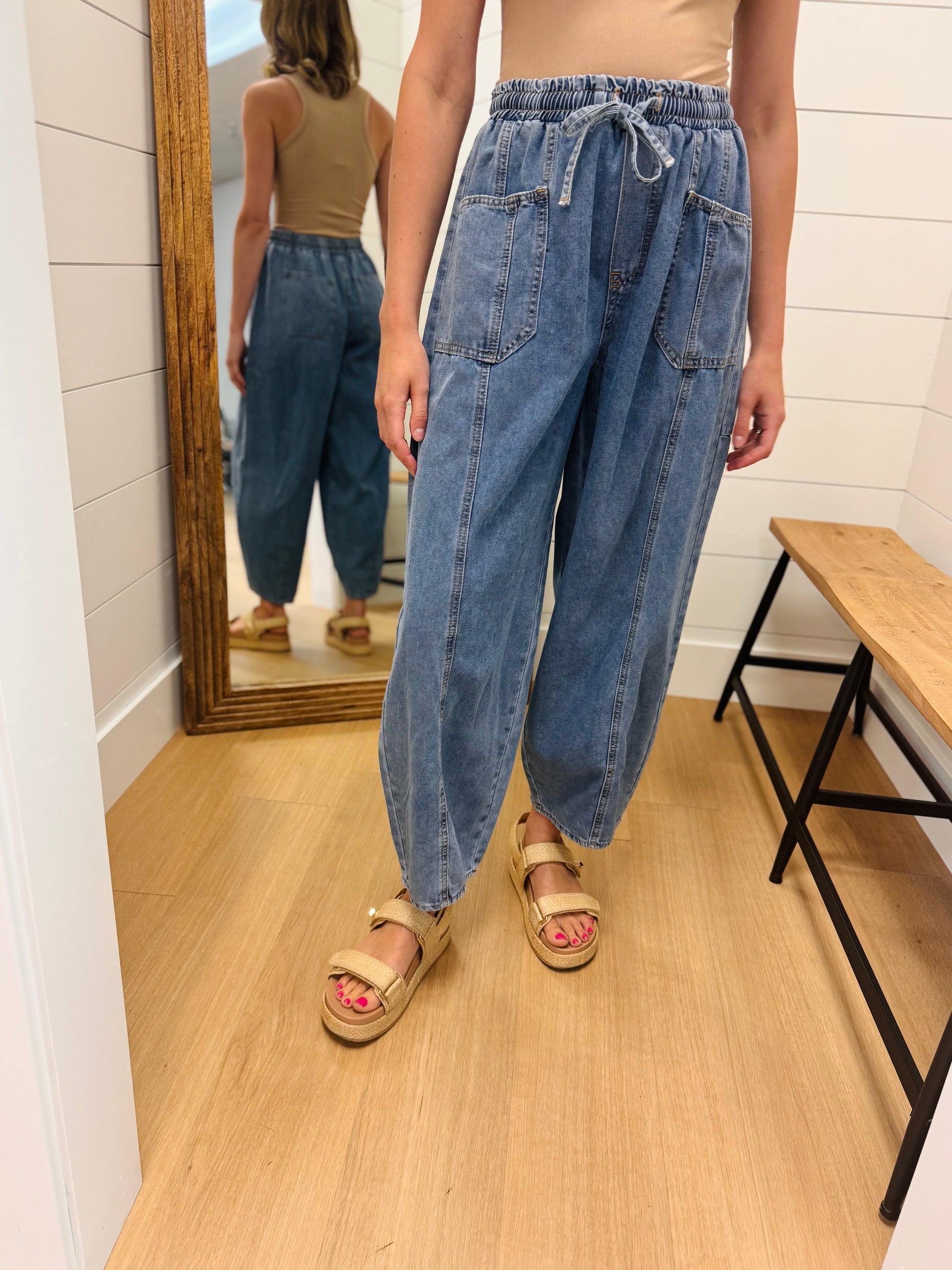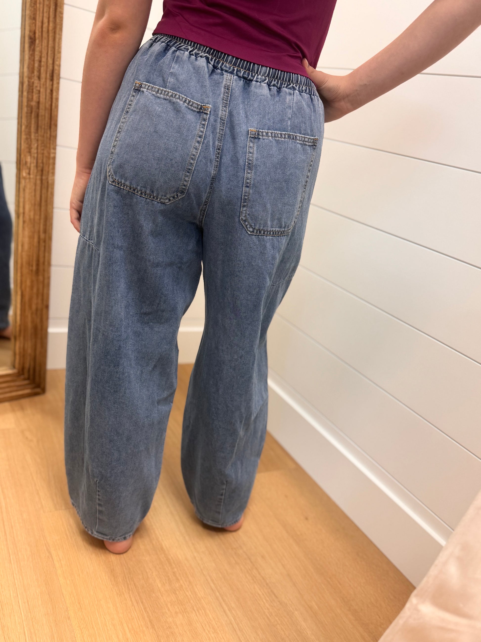 - Washed Chambray Barrel Denim Pants - Elastic Waist - Drawstring - Side & Back Pockets
