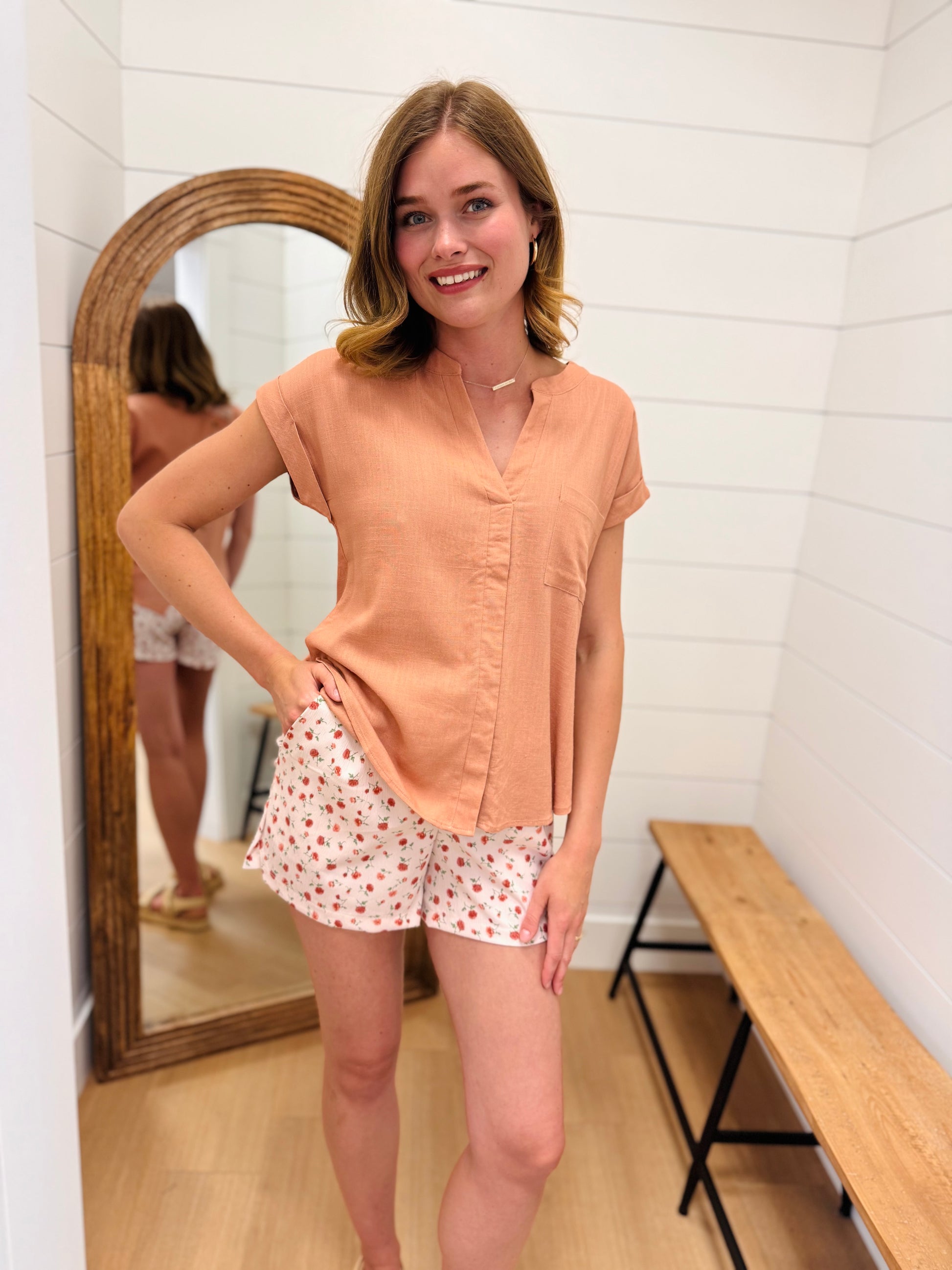 SPLIT NECKLINE SHORT FOLD SLEEVES POCKET