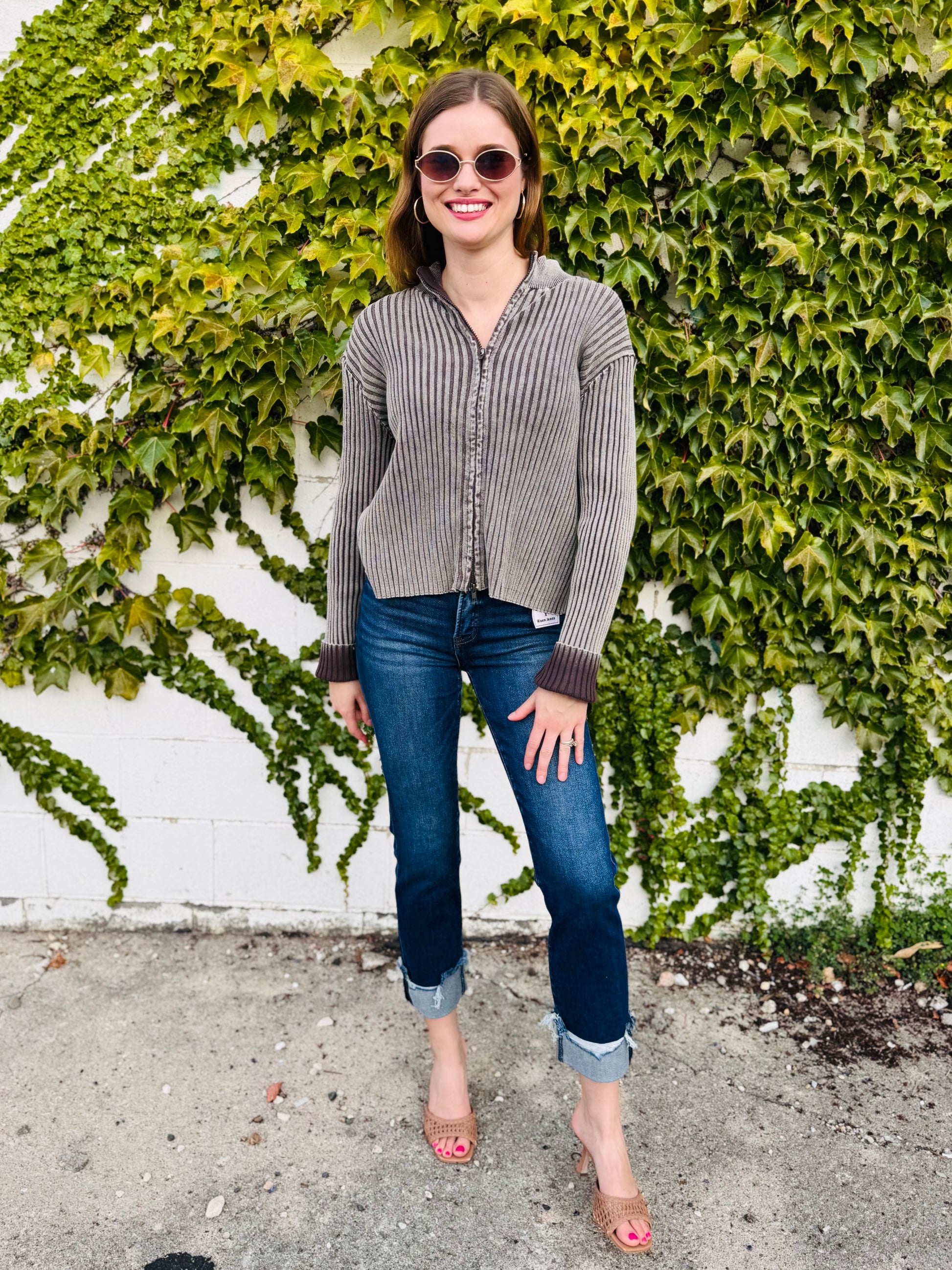 Two Tone Zip Up Sweater - Brown