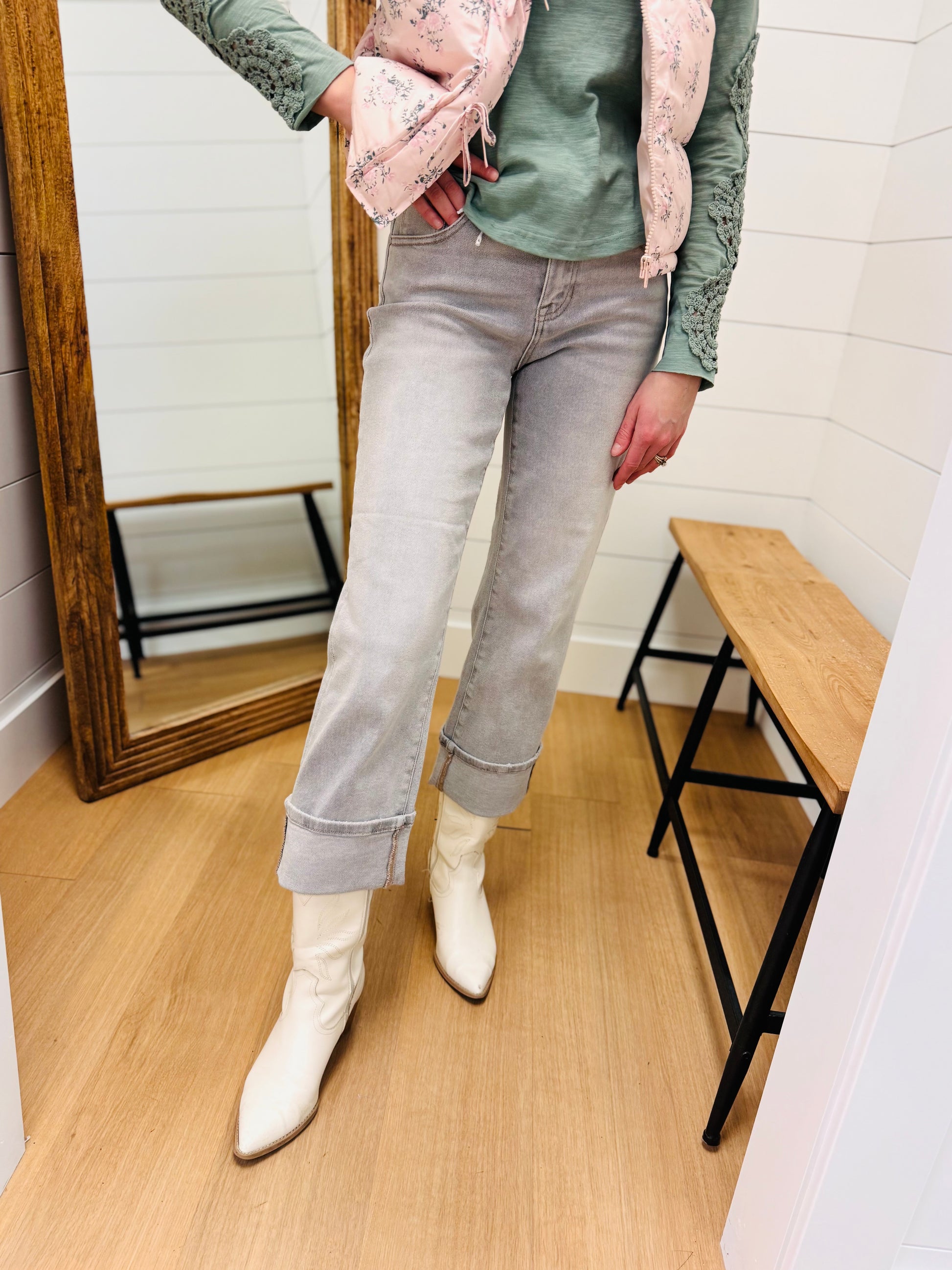 Washed Grey Mid Rise Crop Straight Jeans With Cuff - Risen